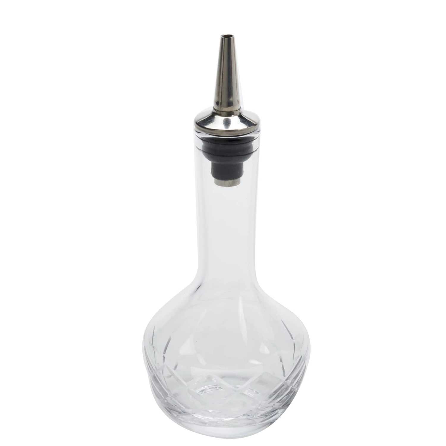 This 4 ounce glass bitters bottle from American Metalcraft features a diamond-cut design and includes a stainless steel and silicone stopper.
