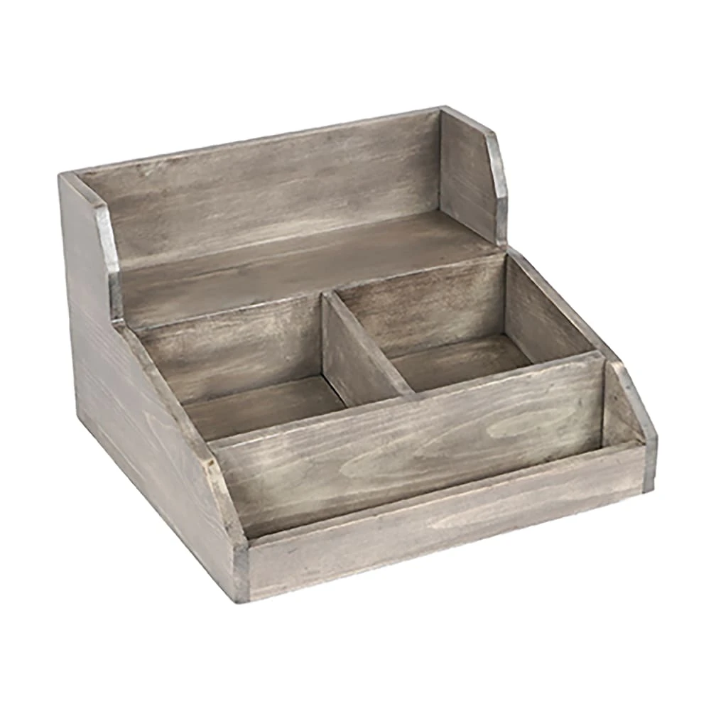 This Aspen 3-section condiment station from Cal-Mil features plenty of room for teas, sugars, or other packets in front as well as two bigger middle sections. This station also has the option to display cups/lids with 3 of the 298-110’s!