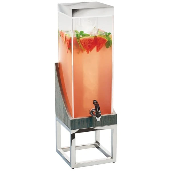 Create an upscale look to your beverage display with this Ashwood Beverage Dispenser from Cal-Mil. It features a durable metal base and a gray-stained oak piece to insert the beverage chamber. It has an ice chamber to help keep beverages chilled for longer. This 3 gallon beverage dispenser also utilizes a mirrored look for the lid and base and is perfect for parties or catering events!