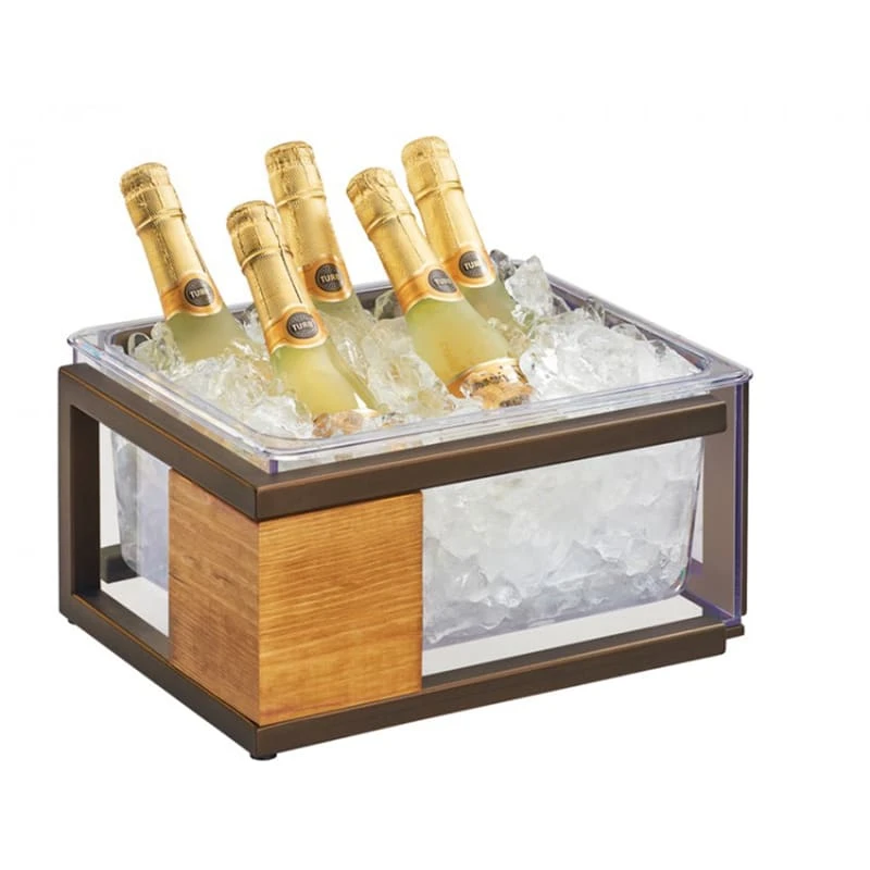 This Sierra Ice Housing from Cal‐Mil is perfect for keeping your bottled beverages or appetizers chilled. It includes an easily removable and durable polycarbonate pan which can be filled with ice. This ice housing is constructed of sturdy metal and reclaimed wood and will add style to any culinary presentation.