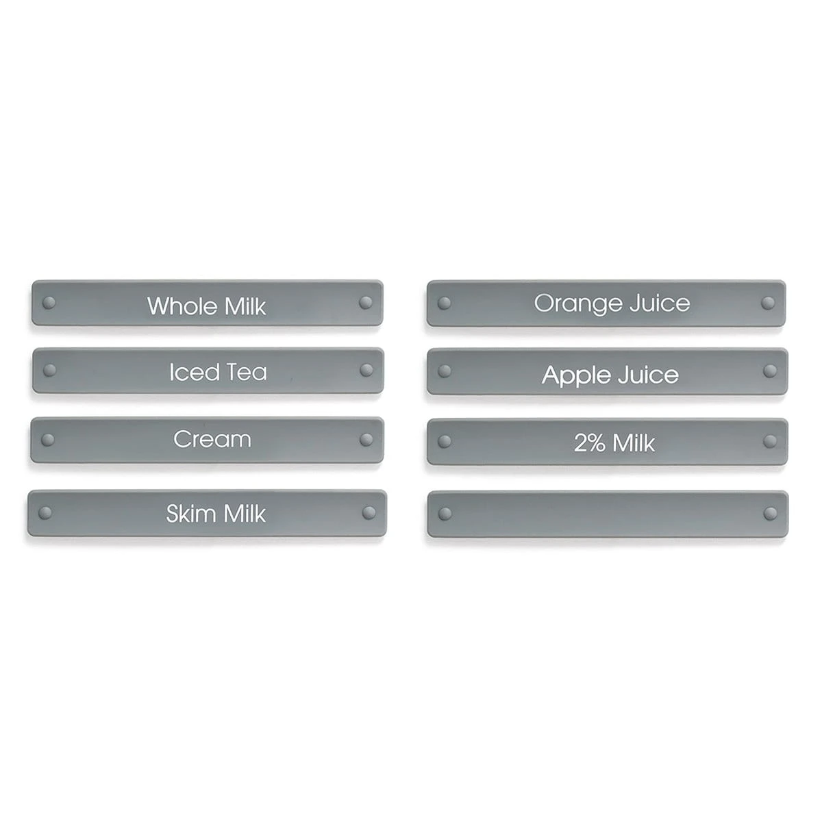 - Includes (1 each): Apple Juice, Orange Juice, Iced Tea, Whole Milk, 2% Milk, Skim Milk, Cream, and Blank