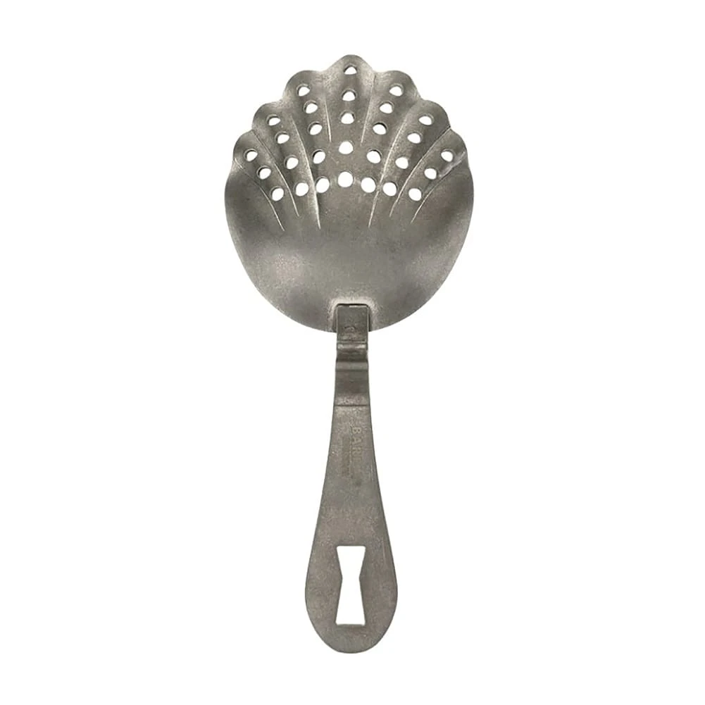 This Julep Strainer from Barfly features a scalloped shape that fits snugly over the shaker, tin or mixing glass. The bend in the handle is for resting on the shaker or glass rim to keep the strainer from slipping.