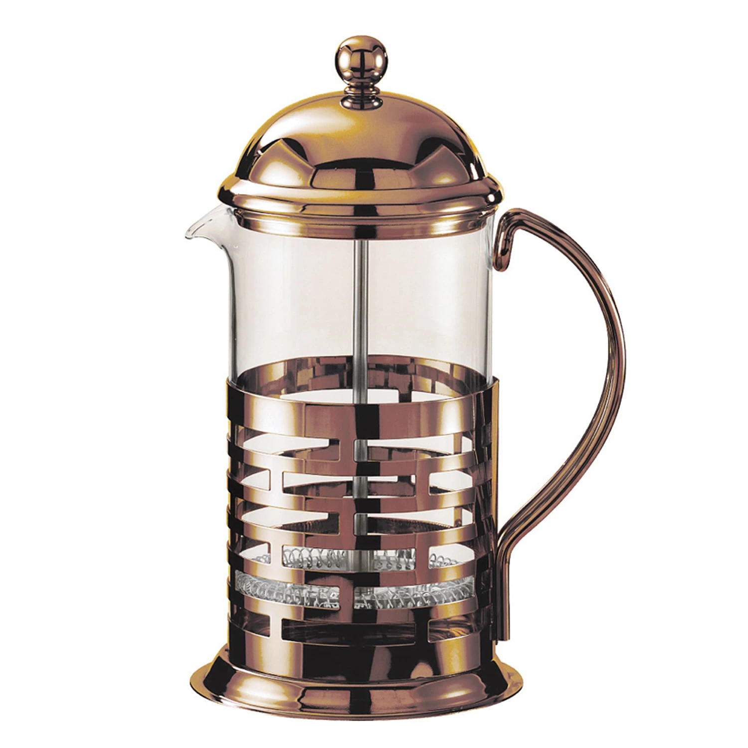 This Service Ideas™ Brick French Press features stainless steel construction in a bronze color and has a glass liner. It has a 1 liter capacity and is ideal for making loose leaf tea or hot chocolate. Hand wash only.